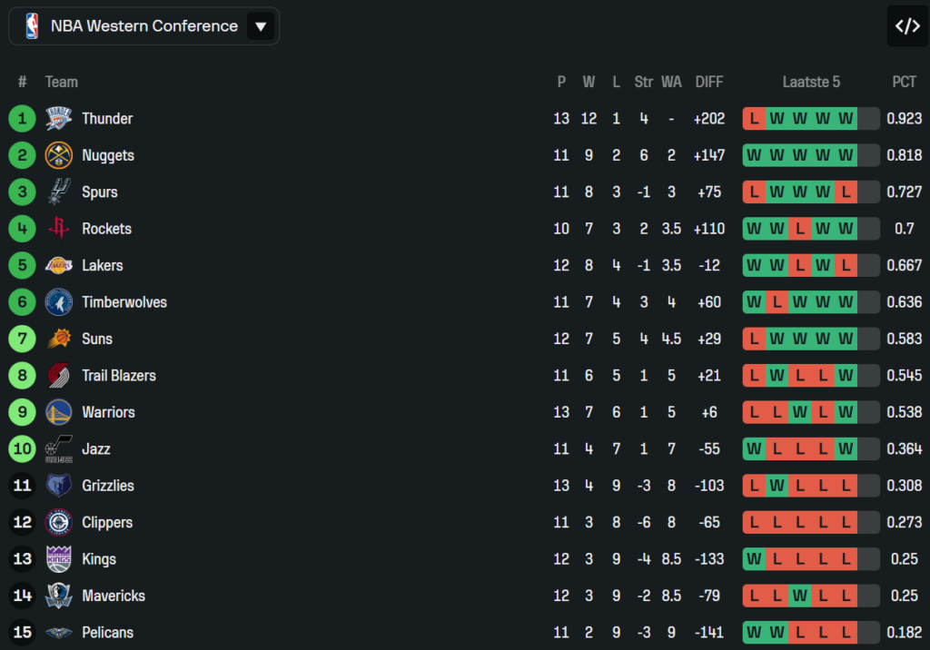 In de Western Conference zijn vooral LA Clippers en Sacramento Kings niet in vorm gebleken. Clippers hebben nu zes duels op rij verloren ondanks al hun sterspelers en lijken hun ritme nog niet gevonden te hebben, terwijl Kings ook flink hebben geïnfesteerd in hun selectie en er weinig voor terugkrijgen. Met vier nederlagen op rij loopt het ook daar niet lekker. Clippers zijn nu 3-8, Kings 3-9.