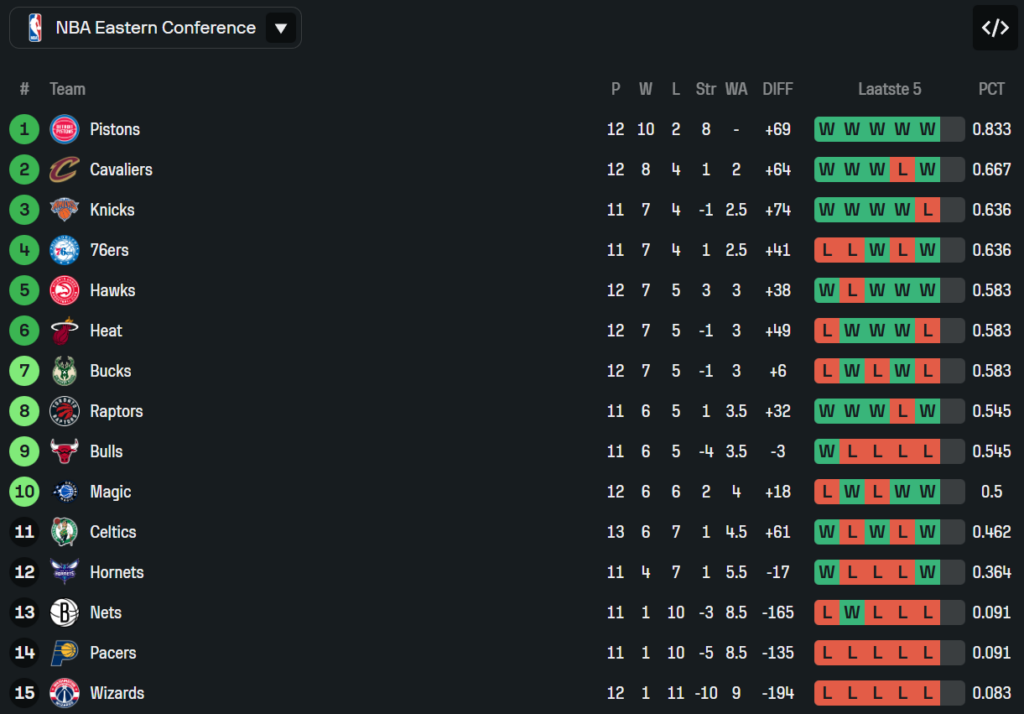 Vier teams kunnen we momenteel wel bestempelen als team die in vorm zijn. Detroit Pistons hebben inmiddels acht duels achter elkaar gewonnen en staan bovenaan in de Eastern Conference met een 10-2 record. Voornaamste aanleiding hiervoor is het duo PG Cade Cunningham en C Jalen Duren. Het programma was niet per se heel zwaar, maar met zeges op Philadelphia 76ers en Chicago Bulls zijn er toch twee sterke teams verslagen.