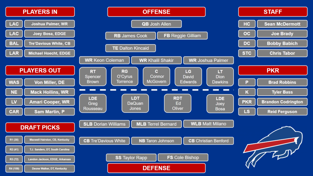 Vier van de voornaamste free agents zijn beoogde versterkingen voor de defense. De Buffalo Bills hebben gezien hoe de Eagles de Chiefs offense ontmantelden in de Super Bowl. Dat was een kwestie van continue druk op de quarterback met met vier verse krachten op de defensive line. Met Michael Hoecht en Larry Ogunjobi komt er kracht en ervaring voor die unit. Joey Bosa vervangt medeveteraan Von Miller en betekent een uitbreiding van de groep edge rushers. De defensive front in Buffalo is daarmee één van de breedst bezette in de league. Tevens werd de secondary uitgebreid met een oude bekende. Voormalig eerste ronde pick (2022) CB Kaiir Elam werd afgetest en vertrok in een trade naar de Cowboys. In het offseason volgde de terugkeer van Tre’Davious White, na twee jaar bij de Los Angeles Rams en Baltimore Ravens.